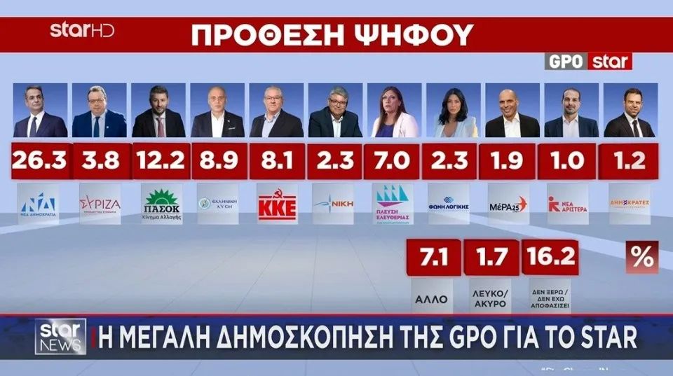 Στην τρίτη θέση βρίσκεται η Ελληνική Λύση με 8,9%, ενώ ακολουθούν το ΚΚΕ με 8,1% και η Πλεύση Ελευθερίας με 7%. Ο ΣΥΡΙΖΑ καταγράφει χαμηλό ποσοστό 3,8%, ενώ η λεγόμενη «γκρίζα ζώνη» των αναποφάσιστων ανέρχεται στο 16,2%.