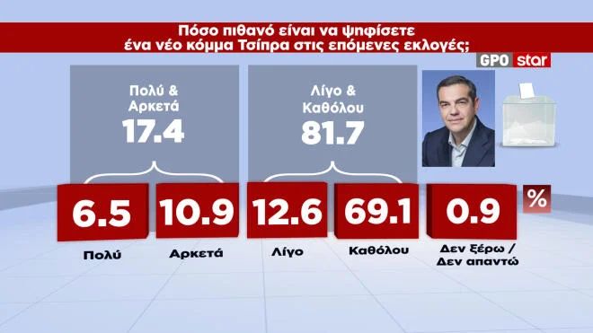 Αντίστοιχα, για ενδεχόμενο κόμμα του Αλέξη Τσίπρα, το 6,5% δηλώνει πολύ πιθανό να το στηρίξει και το 10,9% αρκετά πιθανό.
