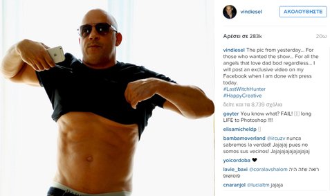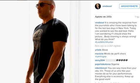 Ο μυώδης και γυμνασμένος πρωταγωνιστής της κινηματογραφικής σειράς 'Fast and Furious' σήκωσε την μπλούζα του για να δείξει τους κοιλιακούς του. Μόλις πριν από μια εβδομάδα ο Vin Diesel έγινε η viral εξαιτίας μιας φωτογραφίας του στο μπαλκόνι ξενοδοχείου στη Φλόριντα. Ο 48χρονος ηθοποιός εθεάθη με αρκετά παραπανίσια κιλά στην κοιλιακή χώρα. Τα social media τρόλαραν την μπιροκοιλιά ενώ η βρετανική Daily Mail έριξε «χολή» παραφράζοντας το 'Fast and Furious' σε 'Fat and Furious'. Ο Αμερικανός σταρ απάντησε μέσω Instagram. «Η φωτογραφία είναι από χθες. Για όσους ήθελαν το σόου. Για όλους τους αγγέλους που αγαπούν τη μπιροκοιλιά... ανεξαρτήτως», έγραψε με χιούμορ ο Vin Diesel και δεσμεύτηκε να ποστάρει άμεσα και σχετικό βίντεο στο Facebook.