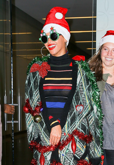 Το πνεύμα των Χριστουγέννων έχει κατακυριεύσει την Μπιγιονσέ. Πήρε τρέσες, μπάλες, σκούφο του Αϊ Βασίλη και ασορτί γυαλιά και ντύθηκε σε χριστουγεννιάτικο για το πάρτι μετά τη δουλειά στη Νέα Υόρκη.