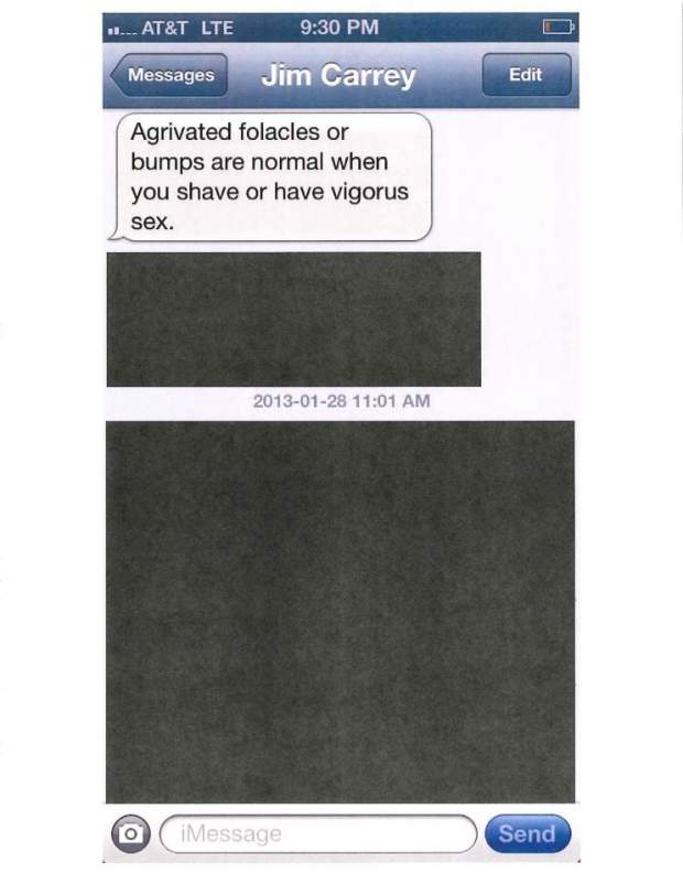 «Εύχομαι να είσαι καλά, μωρό μου. Θα μπορούσε να ήταν από κάποιον πριν από εμένα. Δεν εμφανίζεται μέχρι να εκδηλώσεις άγχος», της απάντησε ο Τζιμ Κάρεϊ προσθέτοντας, θέλοντας προφανώς να την καθησυχάσει, ότι οι κοκκινίλες είναι πιθανό να προέρχονται και από ξύρισμα ή έντονο σεξ.