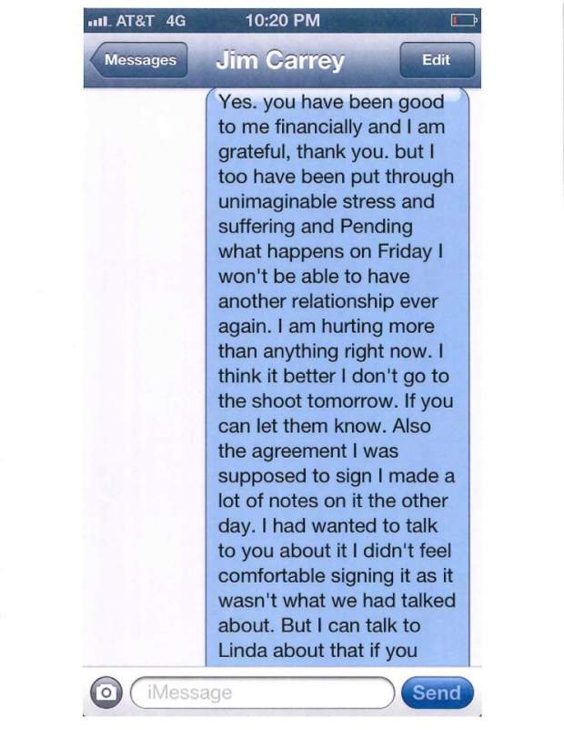 Εντούτοις, σε επόμενα μηνύματά του ο Τζιμ Κάρεϊ εμφανίζεται εξοργισμένος γράφοντας στην make up artist: «Καθ, ήμουν πολύ γενναιόδωρος και υπομονετικός μαζί σου. Δεν ξέρω τι άλλο ζητάς αλλά πιστεύω ότι δεν μπορώ να σε βοηθήσω άλλο.