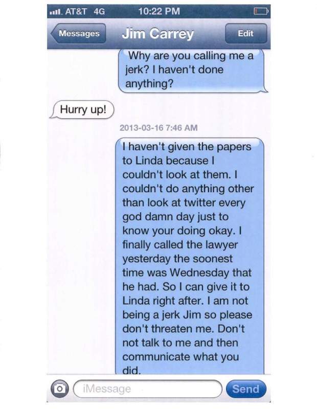 «Έλα, τελείωνε», της απαντά ο χολιγουντιανός ηθοποιός. «Δεν έδωσα τα χαρτιά στην Λίντα γιατί δεν μπόρεσα να τα κοιτάξω. Δεν μπορώ να κάνω τίποτα αλλά από το να κοιτάζω συνέχεια στο Twitter για να δω αν είσαι καλά. Τελικά μίλησα χθες με τη δικηγόρο, το συντομότερο που μπορεί είναι την Τετάρτη. Επομένως μπορώ να τα δώσω στην Λίντα αμέσως μετά. Δεν είμαι ανόητη Τζιμ και για αυτό σε παρακαλώ μην με απειλείς. Μην μου μιλάς και δεν θα επικοινωνώ μαζί σου».