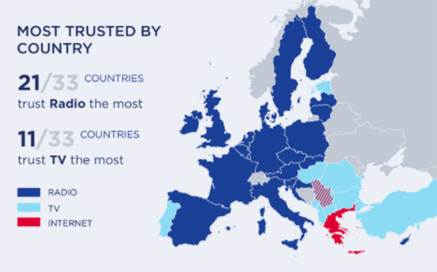Ως εκ τούτου, με βάση πάντα τα ίδια στοιχεία, προκύπτει πως 21 από τις 33 χώρες εμπιστεύονται περισσότερο το ραδιόφωνο και 11 την τηλεόραση.