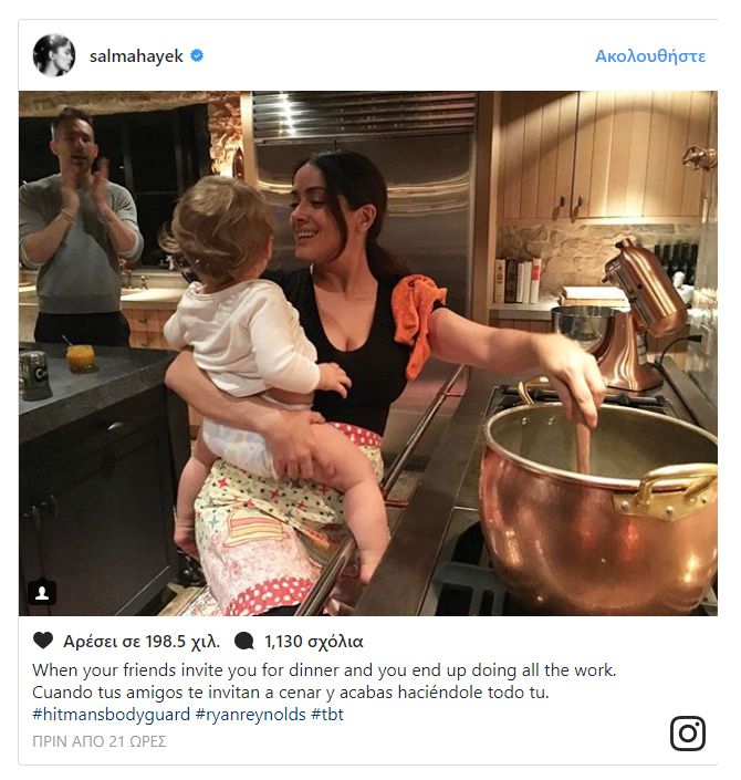 «Όταν οι φίλοι σου σε καλούν για δείπνο και καταλήγεις να κάνεις όλη τη δουλειά» σχολίασε περιπαικτικά η Χάγιεκ κάτω από τη φωτογραφία που έγινε viral στα social media.