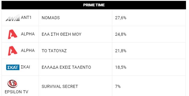 Το Τατουάζ, το Ελλάδα έχεις ταλέντο και το Survival Secret ήταν απέναντι από το NOMADS και σύμφωνα με τους πίνακες της Nielsen το ριάλιτι του ANT1 ήταν πρώτο και στο δυναμικό κοινό άγγιξε σε τέταρτο ακόμα και το 44,1%.