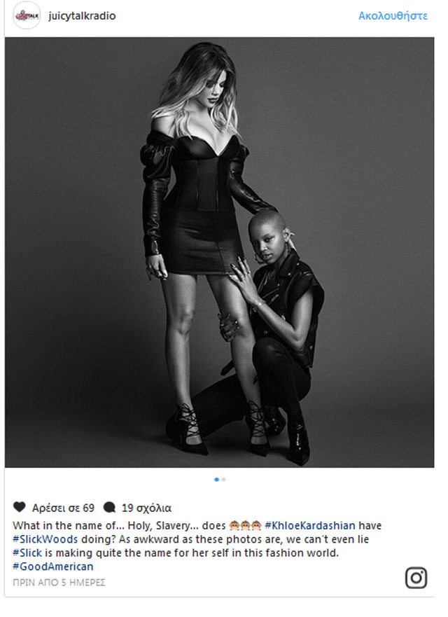 Η Καρντάσιαν δημοσίευσε στο Instragram κάποιες από τις φωτογραφίες για την καμπάνια της Good American, της εταιρείας ρούχων που έχει. Σε μία από αυτές είναι γονατισμένη στα πόδια της η Σλικ Γουντς, ένα μαύρο μοντέλο, ενώ εκείνη την κοιτάζει από ψηλά.
