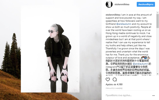 «Νιώθω δέος για το μέγεθος της υποστήριξης και της αγάπης που ξεχύθηκε στον δρόμο μου. Είμαι άφωνη για το πώς οι ακόλουθοί μου έδειξαν την υποστήριξή τους στην κοπέλα μου @andiautumn και σε μένα. Οι άνθρωποι σε όλον τον κόσμο μάς στηρίζουν, καθώς τα ΜΜΕ του Χονγκ Κονγκ συνεχίζουν να μας χλευάζουν» τόνισε.