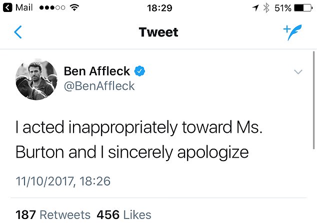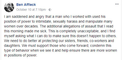 Όλα ξεκίνησαν όταν ο Μπεν Άφλεκ με ανάρτησή του στον προσωπικό του λογαριασμό στο Facebook καταδίκασε τον Χολιγουντιανό παραγωγό Χάρβεϊ Γουαϊνστάιν για τις καταγγελίες που βγαίνουν μία προς μία εις βάρος του από διάσημες ηθοποιούς για σεξουαλικές επιθέσεις εναντίον τους.