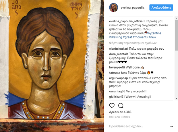 «Η πρώτη μου εικόνα στην βυζαντινή ζωγραφική. Πάντα ήθελα να το δοκιμάσω... Πολύ ενδιαφέρουσα διαδικασία» έγραψε στο Instagram η Εβελίνα Παπούλια, κάτω από μια φωτογραφία που δείχνει το πρώτο της έργο.