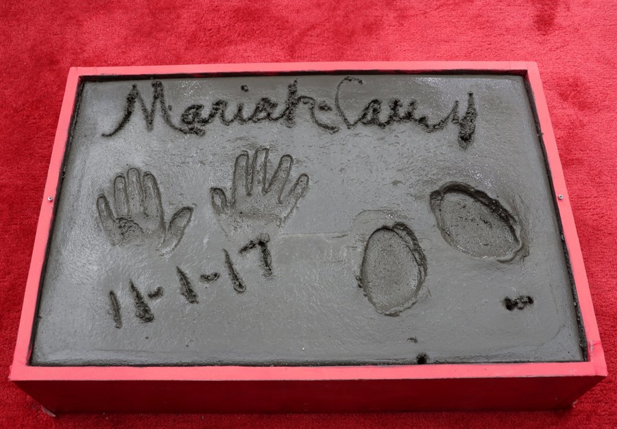 Φορώντας μαύρο εφαρμοστό φόρεμα με αποκαλυπτικό ντεκολτέ, διχτυωτό καλσόν και ψηλοτάκουνα πέδιλα και με πλούσιες ξανθές μπούκλες, η Κάρεϊ έσκυψε και έβαλε την υπογραφή της σε νωπό σκυρόδεμα, στη συνέχεια τοποθέτησε τα χέρια της μέσα σε αυτό το πλαίσιο μετά πάτησε πάνω του – μια διαδικασία που επιφυλάσσεται στους αστέρες που τιμά το Χόλιγουντ.