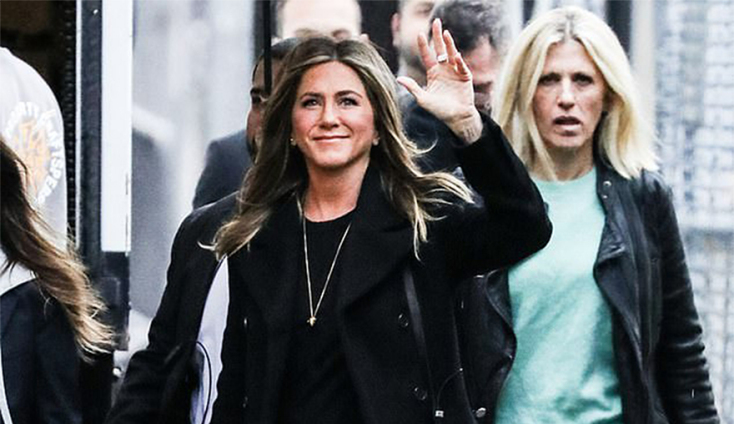 Στα μαύρα και με κολλητό δερμάτινο παντελόνι εμφανίσθηκε η πάντα στιλάτη Τζένιφερ Άνιστον στο στούντιο του Τζίμι Κίμελ Live για να γράψουν το επόμενο επεισόδιο του τηλεοπτικού σόου.
