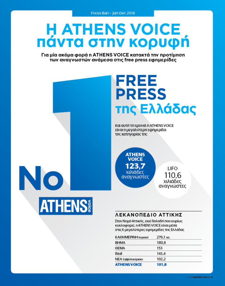 Και για το 2018 η ATHENS VOICE είναι η μεγαλύτερη εφημερίδα της κατηγορίας της
