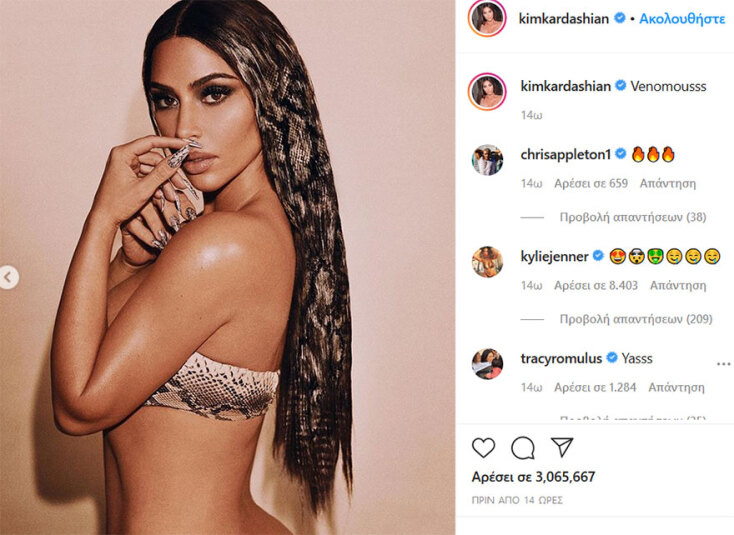 Η τηλεπερσόνα, γνωστή για τις εκκεντρικές της φωτογραφίσεις και τα πολλά της εκατομμύρια, φωτογραφήθηκε σε ένα ιδιαίτερο concept, με θέμα τα σχέδια που έχει στο δέρμα του το φίδι. Η σύζυγος του Κάνιε Γουέστ φόρεσε ρούχα από φίδι και πόζαρε μπροστά από έναν τοίχο, ενώ τα νύχια της κινούνταν στο ίδιο μοτίβο. Επίσης, στα μαλλιά της πέρασε ένα σπρέι με τα σχέδια του φιδιού, ώστε να είναι όλα σεταρισμένα. Στη λεζάντα της φωτογραφίας έγραψε: «Venomousss» για να δείξει ότι είναι γυναίκα-δηλητήριο. Αλλά μάλλον είναι και μεταλλαγμένη.