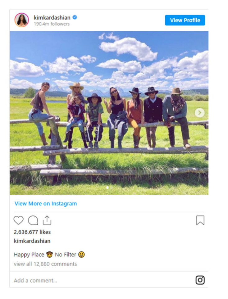 Χωρίς τον Kanye West στο πλευρό της, η Kim Kardashian ανέβασε μια φωτογραφία με τις αδελφές της και τη  μητέρα της. Ντυμένη καουμπόισσα, πόζαρε με φόντο ένα ράντσο και ένα λιβάδι.