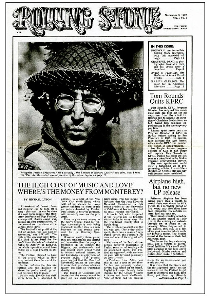 Στο εξώφυλλό του, η εμβληματική φωτογραφία του Τζον Λένον στον ρόλο του στρατιώτη Γκρίπγουιντ σε σκηνή της ταινίας «How I Won The War». Το εναρκτήριο τεύχος φιλοξενούσε επίσης μια συνέντευξη του Ντόνοβαν, ένα φωτορεπορτάζ αφιερωμένο στους Grateful Dead, κείμενα για τους Jefferson Airplane, τους Country Joe & the Fish, ένα γαργαλιστικό ρεπορτάζ γύρω από τον διωγμό του Ντέιβιντ Κρόσμπι από τους Byrds, καθώς και αναφορές σε ένα πρωτοεμφανιζόμενο βρετανικό συγκρότημα που σημείωνε διακριτική επιτυχία στους μουσικούς κύκλους της Δυτικής Ακτής με το άλμπουμ «The Piper at the Gates of Dawn», τους Pink Floyd.