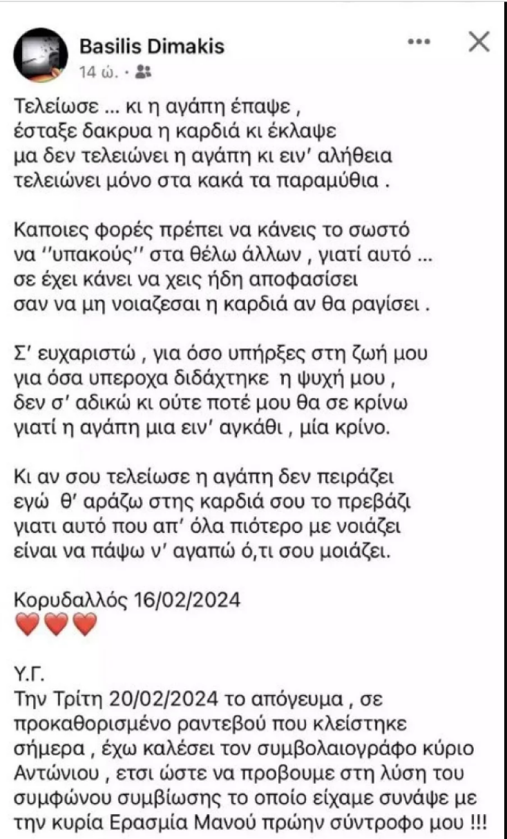 Ο Βασίλης Δημάκης σε ανάρτησή του στα μέσα κοινωνικής δικτύωσης φέρεται να έγραψε: «Την Τρίτη 20/02/2024 το απόγευμα, σε προκαθορισμένο ραντεβού που κλείστηκε σήμερα έχω καλέσει τον συμβολαιογράφο κύριο Αντώνιου, έτσι ώστε να προβούμε στη λύση του συμφώνου συμβίωσης το οποίο είχαμε συνάψει με την κυρία Ερασμία Μάνου πρώην σύντροφο μου!!! Οι λόγοι είναι αυστηρά προσωπικοί και άπτονται της ιδιωτικότητας του καθενός μας ξεχωριστά και προφανώς δεν είναι ανακοινώσιμοι και ούτε αφορούν και κανέναν στο κάτω κάτω της γραφής!!! Το διαζύγιό μας άλλωστε, είναι απολύτως συναινετικό και θεωρούμε ότι είναι το καλύτερο και για τους δυο μας την προκειμένη στιγμή!!! Άλλωστε ο γράφων, έχει αποφασίσει στη ζωή του να μην παρεμβαίνει στην φυσική ροή των πραγμάτων!!! Όπως επίσης πολύ καλά γνωρίζω ότι ενίοτε ‘’κάθε εμπόδιο για καλό’’!!! Επίσης εύχομαι, σήμερα που είναι η γενέθλια ημέρα της, να τα εκατοστίσει, να παλεύει για ό,τι αγαπάει, να είναι πάντα γερή, δημιουργική και με ελεύθερη βούληση!!!».