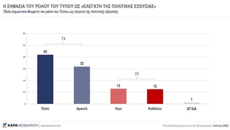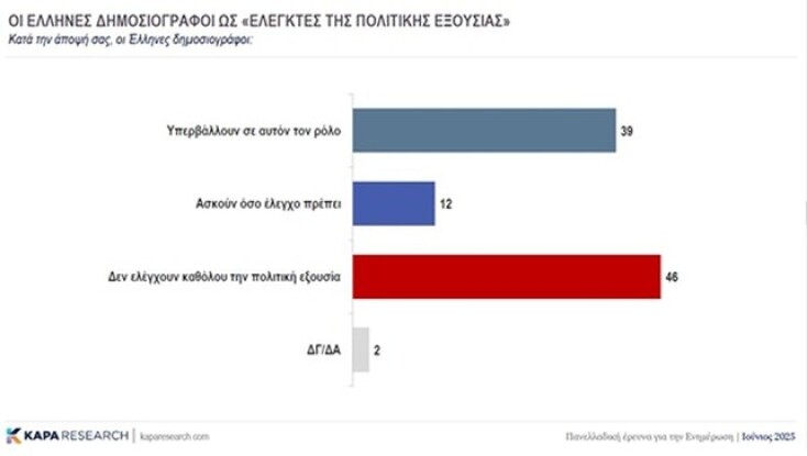 Ωστόσο οι πολίτες είναι διχασμένοι για τον τρόπο που οι δημοσιογράφοι ασκούν τον ρόλο τους ως ελεγκτές της εξουσίας, με σχεδόν τους μισούς (46%) να θεωρούν ότι οι Έλληνες δημοσιογράφοι δεν ελέγχουν καθόλου την πολιτική εξουσία και ταυτόχρονα ένα σημαντικό ποσοστό (39%) να θεωρεί ότι υπερβάλλουν στον ρόλο τους ως ελεγκτές.