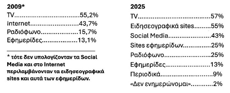 Δεκατέσσερα χρόνια αργότερα, η εικόνα δεν έχει αλλάξει όσον αφορά στο ποσοστό των εφημερίδων αλλά και την πρωτιά της τηλεόρασης. Η τηλεόραση κρατά οριακά τα σκήπτρα της ενημέρωσης, με τις ειδησεογραφικές ιστοσελίδες να ακολουθούν, ενώ υψηλή εξακολουθεί να είναι η κατανάλωση ειδήσεων από τα Μέσα Κοινωνικής Δικτύωσης. Παράλληλα, το μερίδιο των εφημερίδων το 2009 ήταν 13,1% και το 2025 είναι 13%.