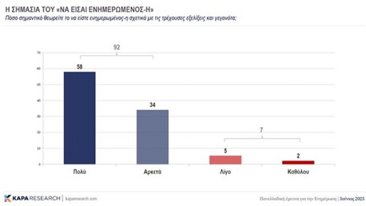 Σχεδόν 7 στους δέκα Έλληνες ενημερώνονται τουλάχιστον μία φορά την ημέρα, ενώ οι 9 στους δέκα θεωρούν ότι είναι σημαντικό να ενημερώνονται. Ωστόσο, είναι διχασμένοι αν οι Έλληνες δημοσιογράφοι ασκούν σωστά τον ρόλο τους ως ελεγκτές της εξουσίας.