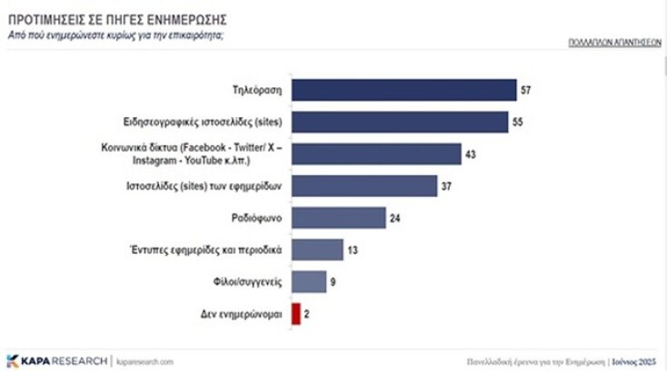 Σύμφωνα με έρευνα* του Εργαστηρίου Ερευνητικής Δημοσιογραφίας του Α.Π.Θ., «το 57% δηλώνει ότι ενημερώνεται από την τηλεόραση, το 55% από τις ειδησεογραφικές ιστοσελίδες, το 43% από τα Μέσα Κοινωνικής Δικτύωσης, ενώ μόλις 37% από τις ιστοσελίδες εφημερίδων, 25% από το ραδιόφωνο, 13% από τις έντυπες εκδόσεις των εφημερίδων και περιοδικά, 9% από φίλους και συγγενείς και 2% δηλώνει ότι δεν ενημερώνεται».