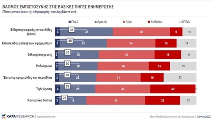 * Την έρευνα διεξήγαγε το Εργαστήριο Ερευνητικής Δημοσιογραφίας (Peace Journalism Lab) του Α.Π.Θ., με επιστημονικά υπεύθυνο τον Καθηγητή Νικόλαο Παναγιώτου σε συνεργασία με την KAPA RESEARCH για τις Συνήθειες και τις Αντιλήψεις γύρω από την Ενημέρωση στην Ελλάδα. Πρόκειται για πανελλαδική έρευνα κοινής γνώμης, με δείγμα 1.014 πολίτες ηλικίας 15 ετών και άνω, με βάση την απογραφή ΕΛΣΤΑΤ το 2021 και διενεργήθηκε το διάστημα 30 Μαΐου έως 10 Ιουνίου 2025. Ολόκληρη η έρευνα θα παρουσιαστεί στις 2 και 3 Ιουλίου στη Θεσσαλονίκη, στο Συνέδριο Thessaloniki Conference on Global Media and Culture 2025, και θα δημοσιευθεί σε επιστημονικά περιοδικά.