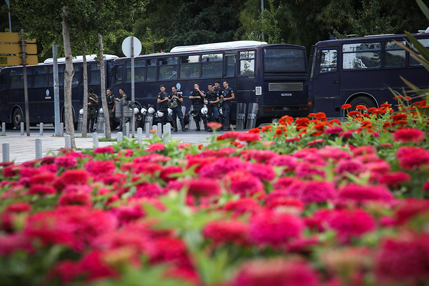 Τα μέτρα ασφαλείας είναι δρακόντεια, με κάγκελα και φραγμούς από κλούβες των ΜΑΤ, κάνοντας σχεδόν αδύνατη την προσέγγιση στο Συνεδριακό Κέντρο.