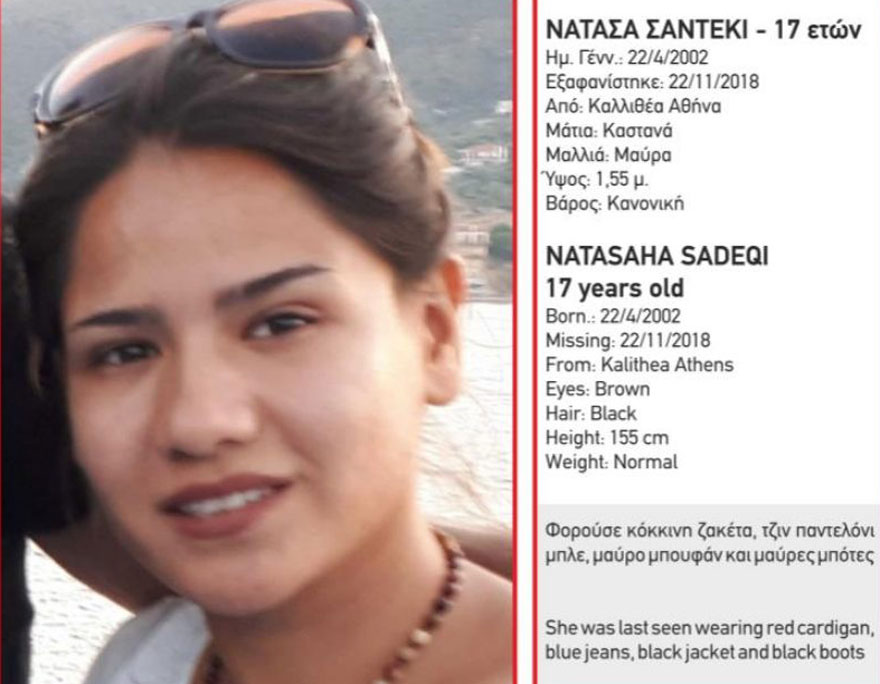 Σύμφωνα με το Χαμόγελο του Παιδιού « η Νατάσα Σαντέκι, 17 ετών, αφγανικής καταγωγής εξαφανίστηκε την περασμένη Πέμπτη (22/11/2018) από την περιοχή της Καλλιθέας στην Αθήνα.