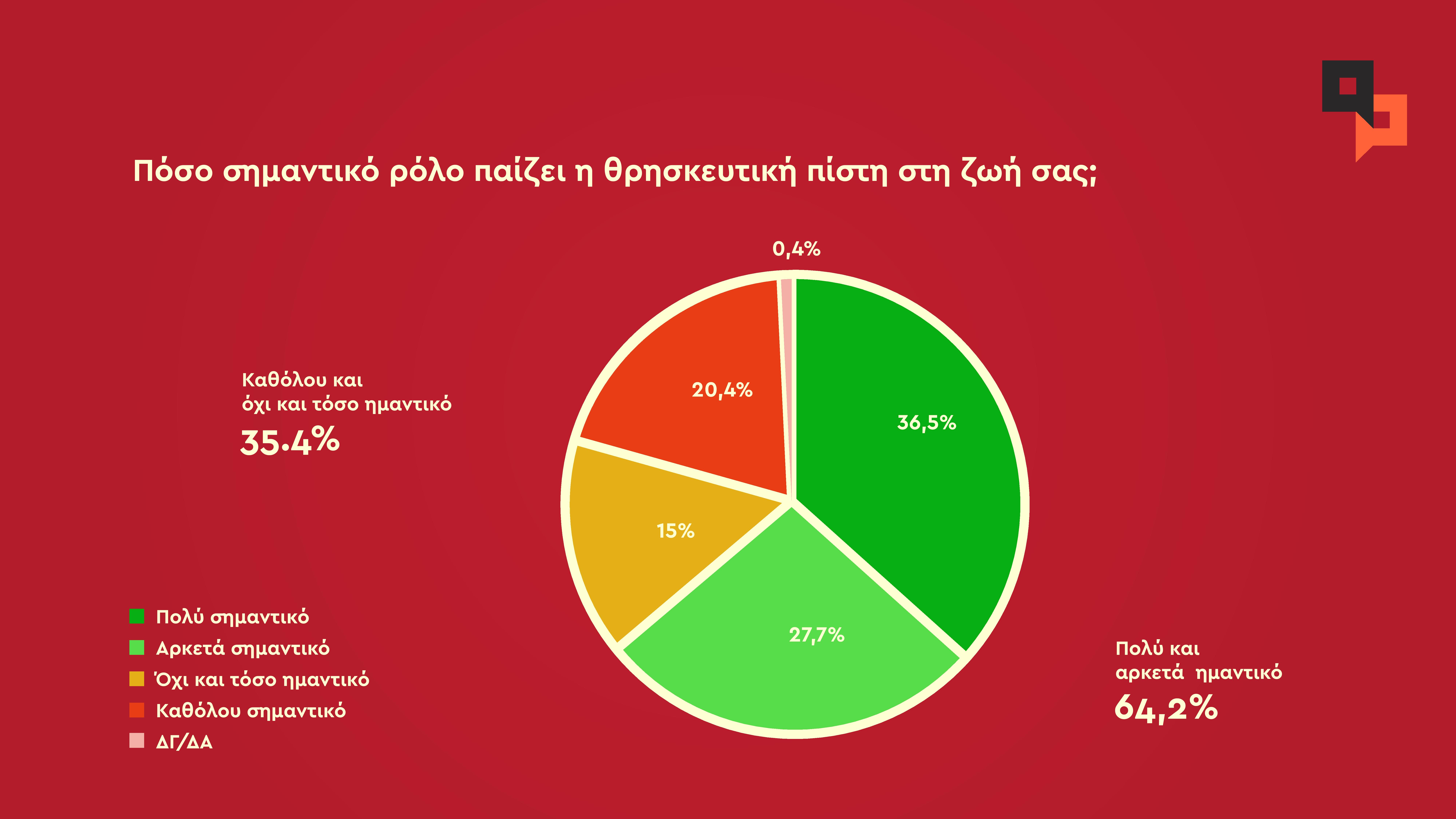 2 στους 3 ερωτώμενους (64,2%) απαντούν ότι η θρησκευτική πίστη παίζει πολύ και αρκετά σημαντικό ρόλο στη ζωή τους. Μεγαλύτερα ποσοστά στις γυναίκες, στις μεγάλες ηλικίες και στους κατοίκους εκτός Αττικής.