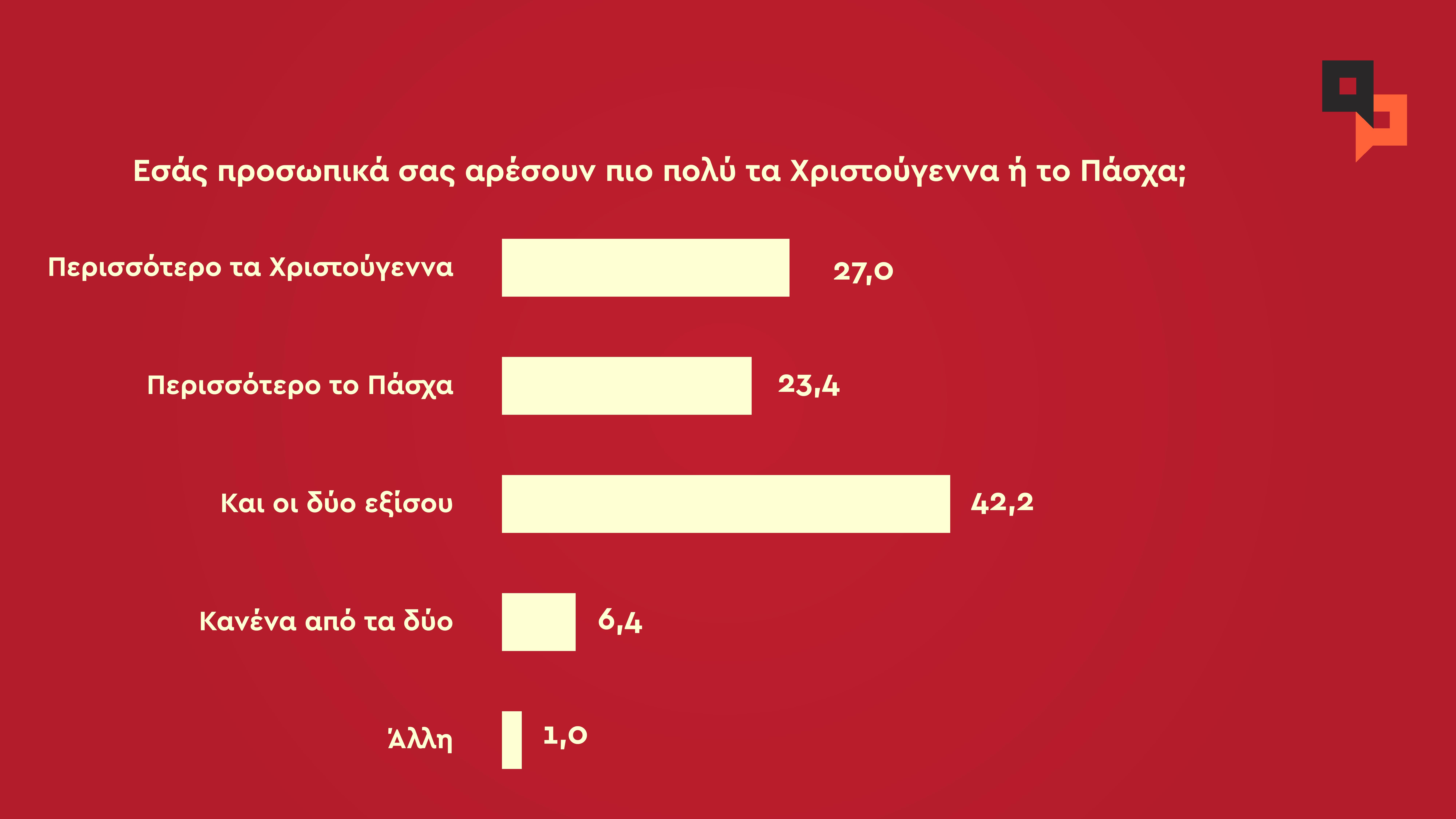 Τα Χριστούγεννα είναι η αγαπημένη γιορτή για το 27% και το Πάσχα για το 23,4%. Το 42,2% απάντησε και οι δύο γιορτές εξίσου.