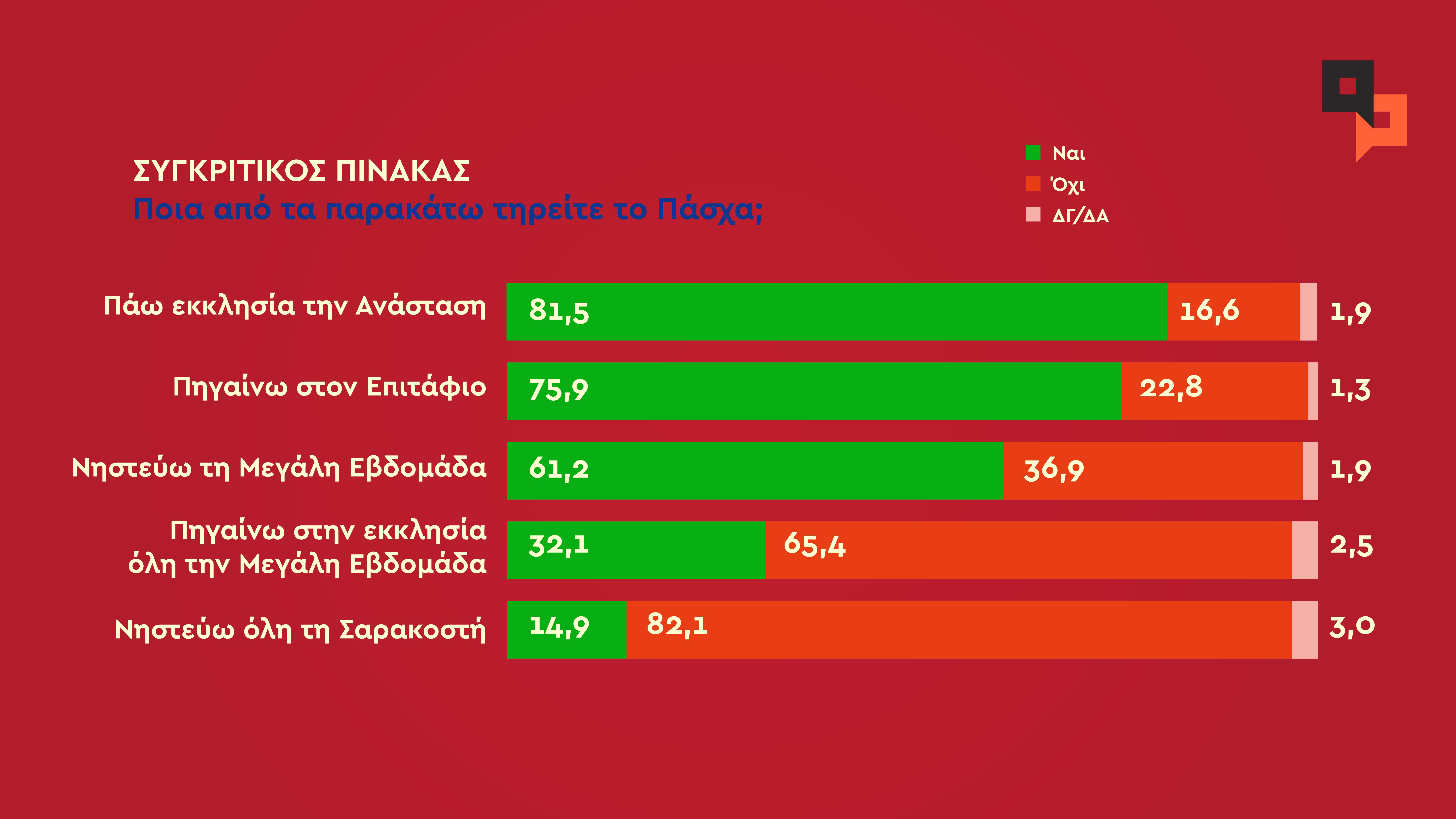 Το 81,5% πηγαίνει στην εκκλησία την Ανάσταση, το 75,9% στον Επιτάφιο και το 32,1% όλη τη Μεγάλη Εβδομάδα.
