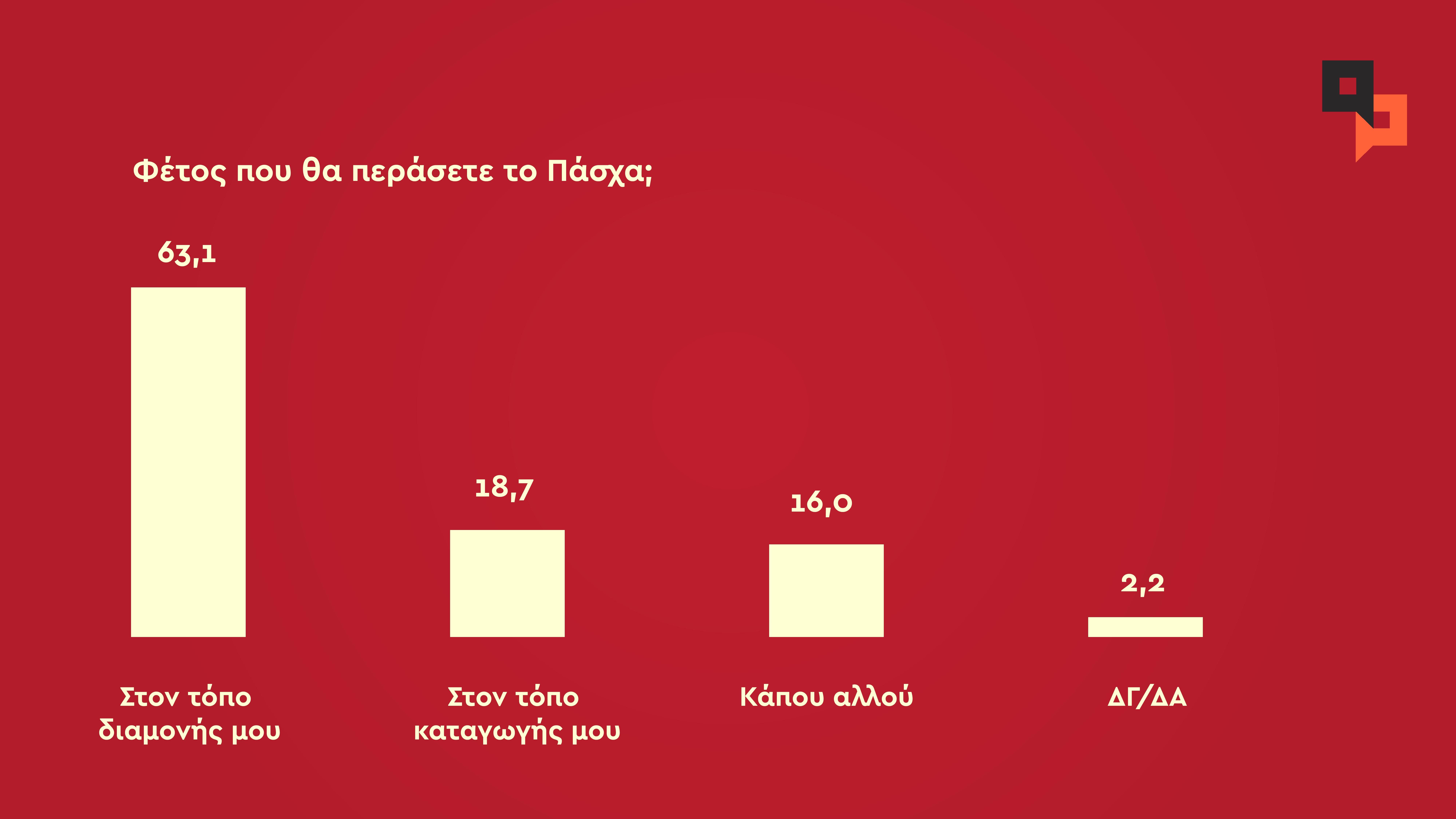 Το 63,1% θα κάνει Πάσχα στον τόπο διαμονής τους, το 18,7% στον τόπο καταγωγής του και το 16% κάπου αλλού. Οι κάτοικοι Αττικής θα μετακινηθούν σε μεγαλύτερο ποσοστό από τους κατοίκους της υπόλοιπης Ελλάδας.