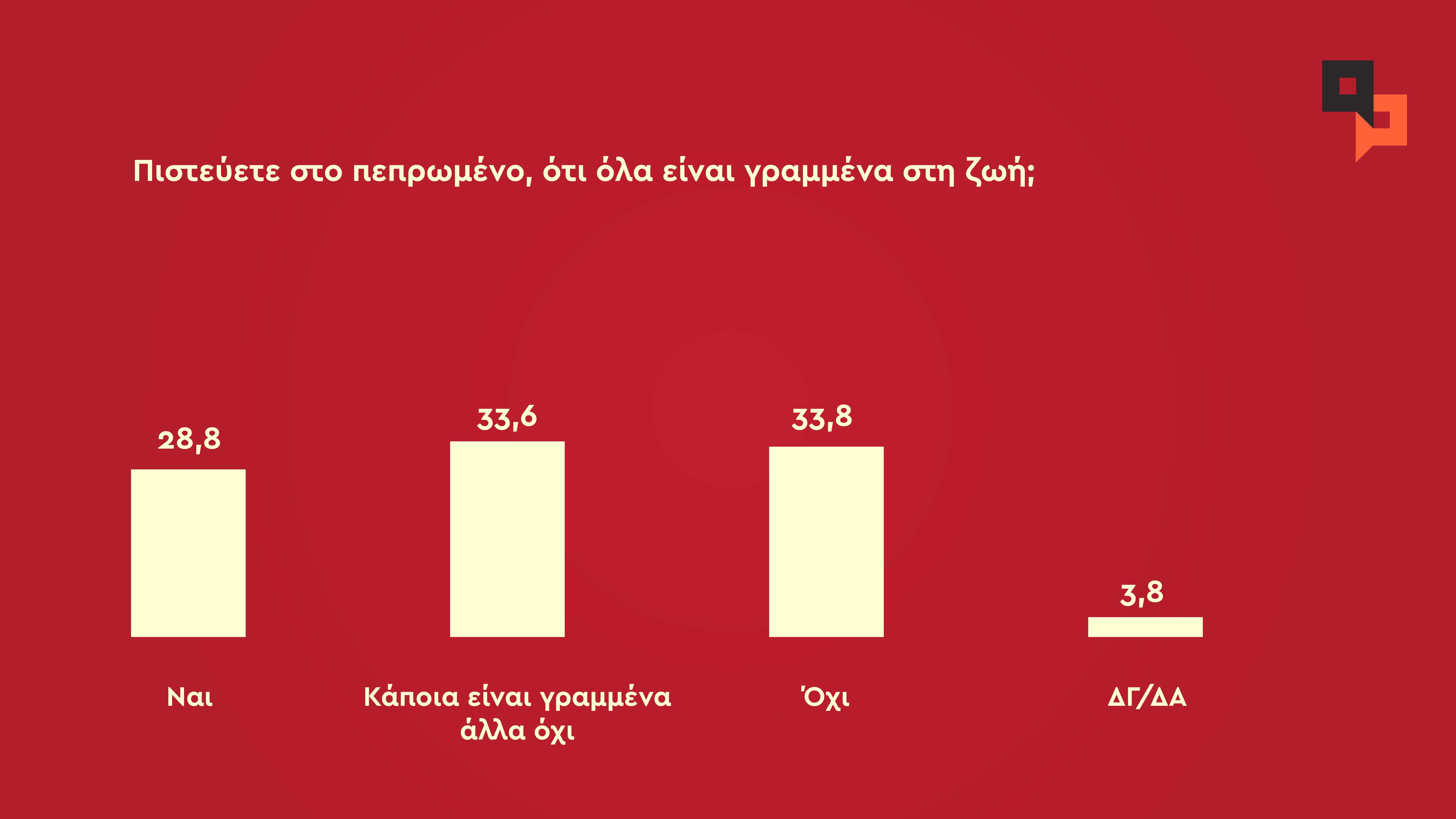Το 28,8% πιστεύει στο πεπρωμένο (ότι όλα στη ζωή είναι γραμμένα), το 33,6 θεωρεί ότι κάποια πράγματα είναι γραμμένα και κάποια όχι, ενώ διαφωνεί το 33,8%.