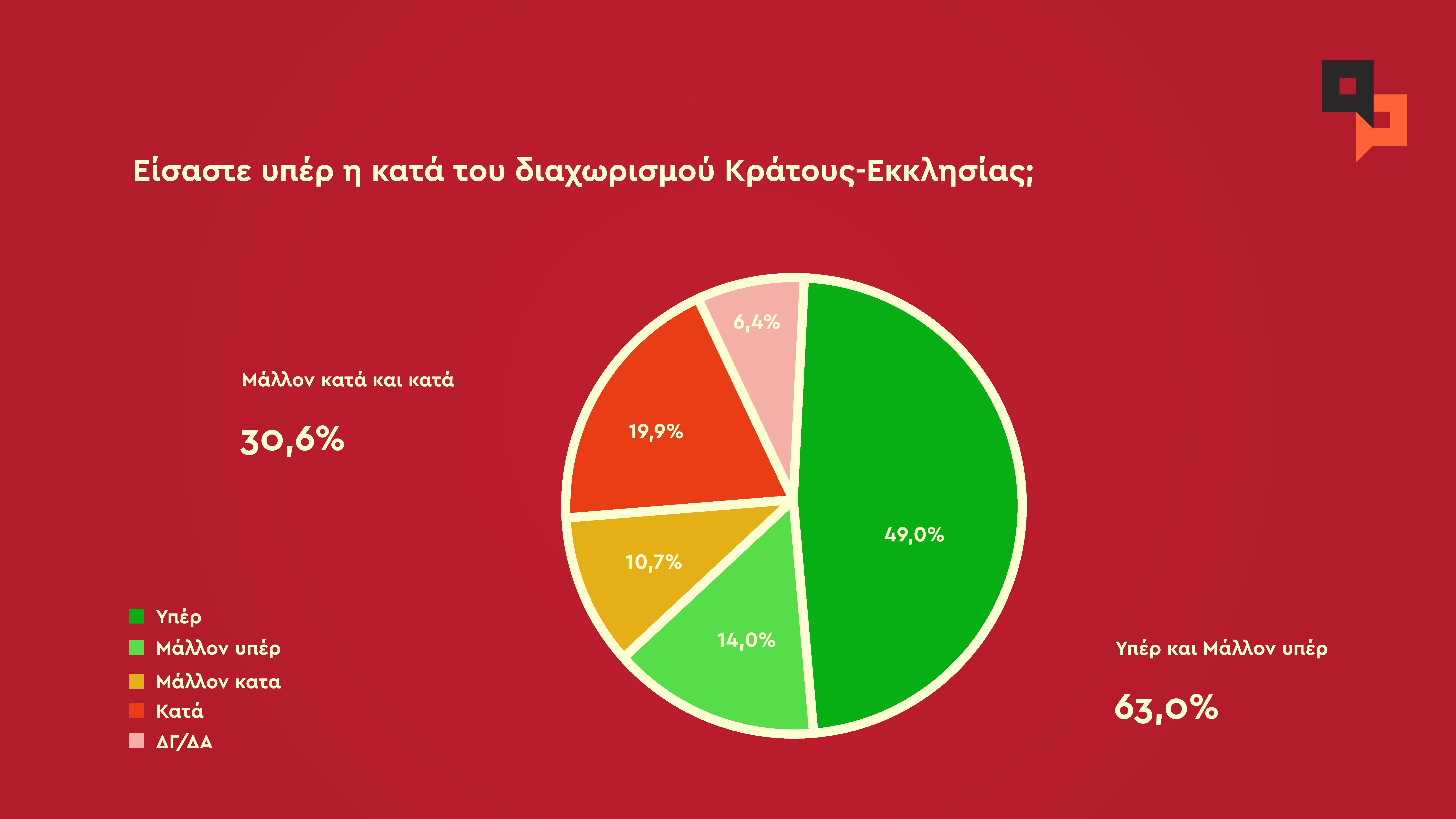 Τέλος, το 63% των ερωτώμενων είναι υπέρ του διαχωρισμού κράτους-εκκλησίας.