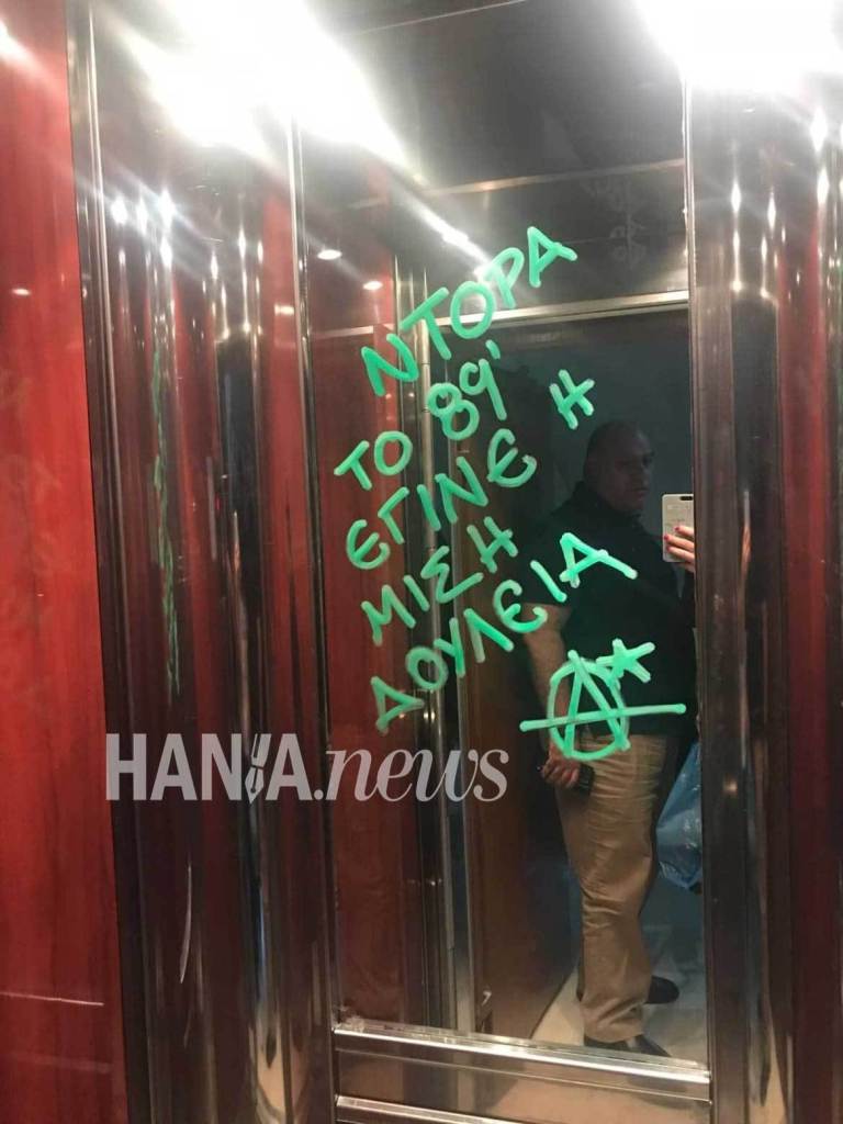Χυδαία συνθήματα κι απειλές με αναφορά στη δολοφονία του Παύλου Μπακογιάννη έγραψαν άγνωστοι στο πολιτικό γραφείο της Ντόρας στα Χανιά
