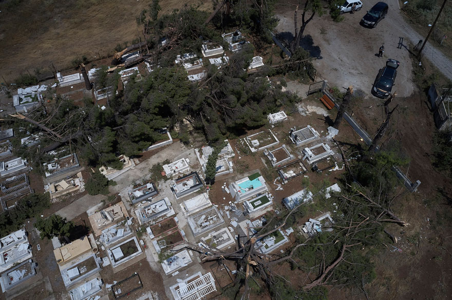 Μη επανδρωμένο πτητικό μέσο (drone) πέταξε πάνω από τις πληγείσες περιοχές, καταγράφοντας εικόνες που παραπέμπουν σε κινηματογραφική ταινία.