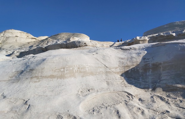 Ωστόσο, υπάρχουν κάποιοι οι οποίοι -αδιαφορώντας για τη ζημιά που προκαλούν στο φυσικό τοπίο- σκαλίζουν (!) λέξεις στα λευκά βράχια. Οι φωτογραφίες που δημοσίευσε το milosvoice.gr είναι αποκαλυπτικές.