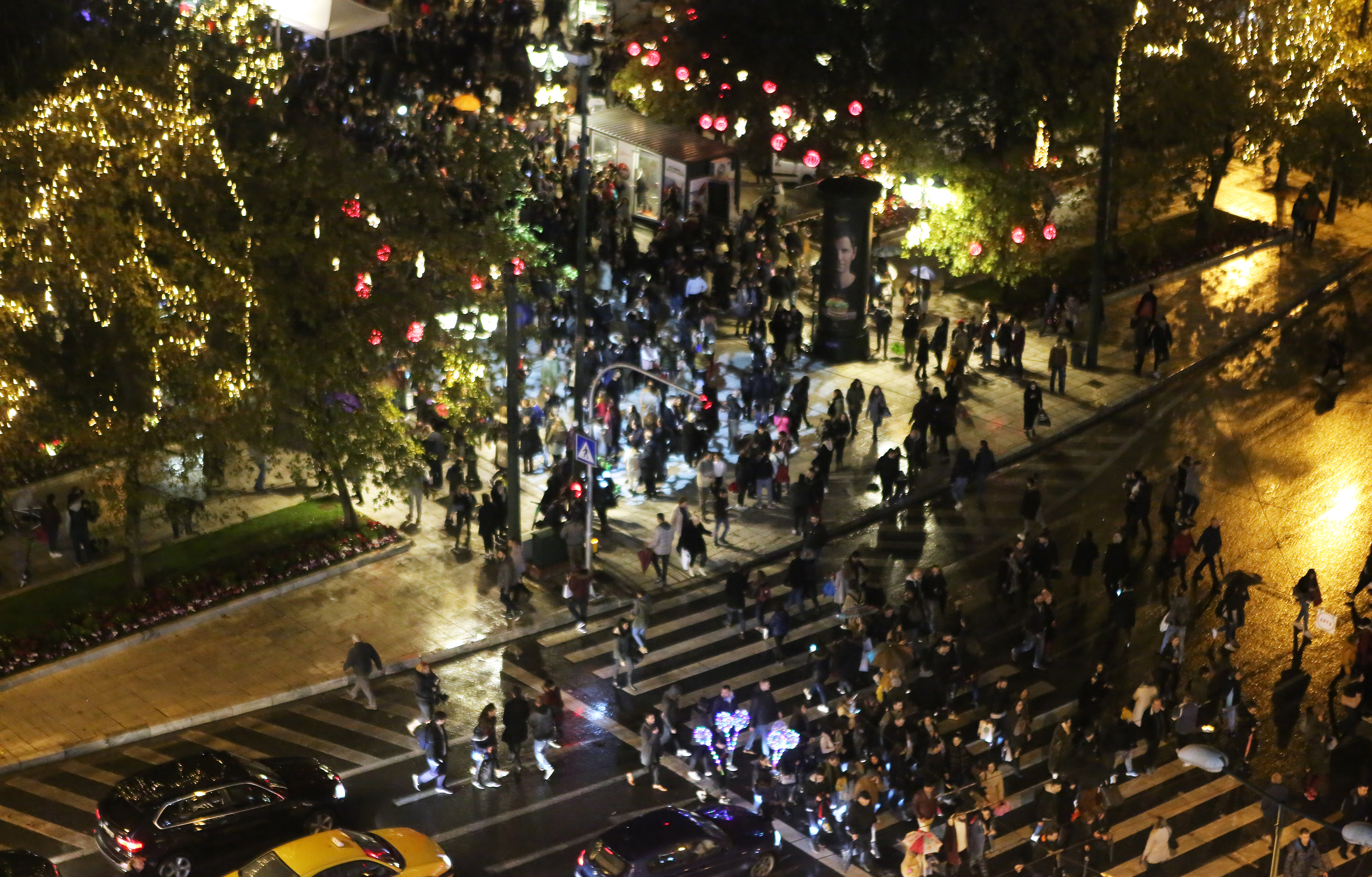 Η βροχή δεν φάνηκε να πτοεί τις Αθηναίες και τους Αθηναίους που βρέθηκαν στο Σύνταγμα το απόγευμα, για την πολυαναμενόμενη φωταγώγηση της πόλης, το άναμμα του φυσικού δέντρου -ύψους 17 μέτρων- που κοσμεί την πλατεία από τον δήμαρχο Αθηναίων, Κώστα Μπακογιάννη.
