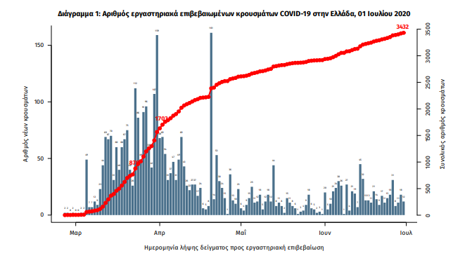 Ο συνολικός αριθμός των κρουσμάτων κορωνοϊού στην Ελλάδα είναι 3.432, εκ των οποίων το 55% αφορά άνδρες. Στην Εντατική παραμένουν 9 συμπολίτες μας, με τη διάμεση ηλικία τους να είναι τα 58 έτη.