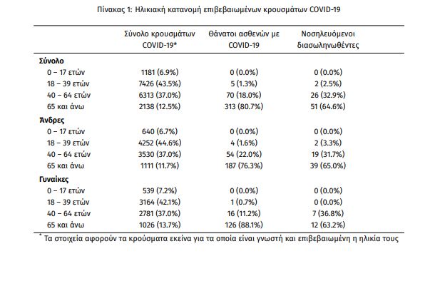 » Τέλος, έχουμε 5 ακόμα καταγεγραμμένους θανάτους και 388 θανάτους συνολικά στη χώρα. 143 (36.9%) γυναίκες και οι υπόλοιποι άνδρες. Η διάμεση ηλικία των θανόντων συμπολιτών μας ήταν τα 78 έτη και το 96.6% είχε κάποιο υποκείμενο νόσημα ή/και ηλικία 70 ετών και άνω».