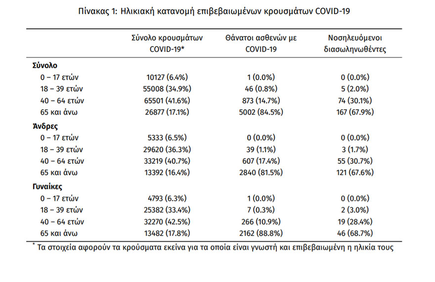 » Τέλος, έχουμε 19 νέους θανάτους από τη νόσο COVID-19, φθάνοντας τους 5922 θανάτους συνολικά στη χώρα, εκ των οποίων 3485 (58.8%) άνδρες. Η διάμεση ηλικία των θανόντων συμπολιτών μας ήταν τα 79 έτη και το 95.5% είχε κάποιο υποκείμενο νόσημα ή/και ηλικία 70 ετών και άνω».