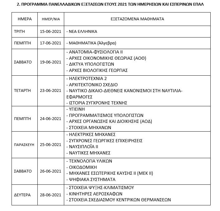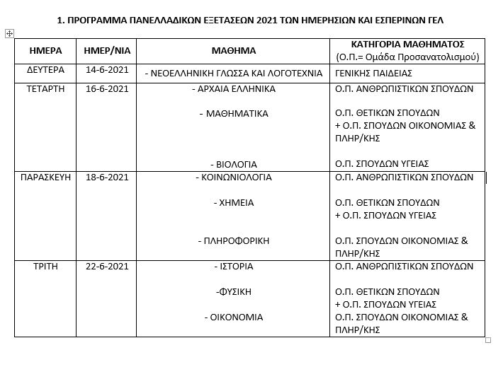 Το Υπουργείο Παιδείας και Θρησκευμάτων ανακοίνωσε το απόγευμα της Τετάρτης (12/5) το πρόγραμμα των πανελλαδικών εξετάσεων Γενικών Λυκείων και Επαγγελματικών Λυκείων 2021, όπως αυτό καθορίστηκε με σχετικές Υπουργικές Αποφάσεις.