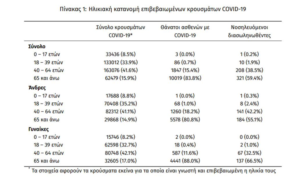 » Ο συνολικός αριθμός των κρουσμάτων ανέρχεται σε 396.970 (ημερήσια μεταβολή +0.5%), εκ των οποίων 51.2% άνδρες. Με βάση τα επιβεβαιωμένα κρούσματα των τελευταίων 7 ημερών, 24 θεωρούνται σχετιζόμενα με ταξίδι από το εξωτερικό και 2.013 είναι σχετιζόμενα με ήδη γνωστό κρούσμα.