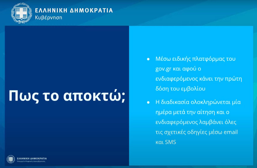 Τέλος, η απόκτησή της είναι απλή, καθώς θα είναι διαθέσιμη μέσω ειδικής πλατφόρμας του gov.gr και ο ενδιαφερόμενος, μία ημέρα μετά την αίτησή του, θα λαμβάνει όλες τις σχετικές οδηγίες είτε μέσω sms είτε μέσω ηλεκτρονικού μηνύματος.