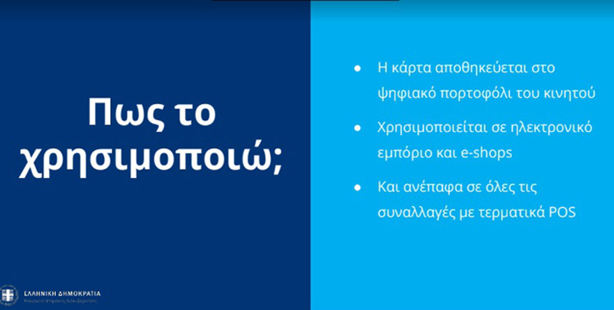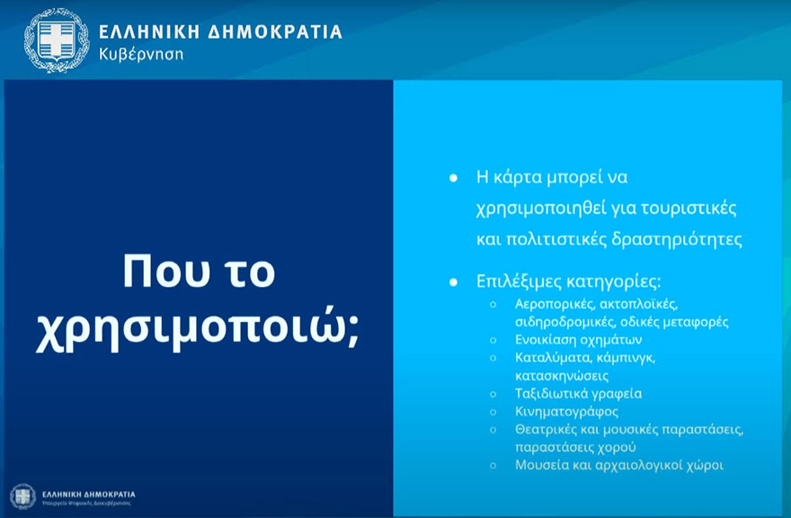 Όπως τόνισε ο κ. Πιερρακάκης, θα χρησιμοποιείται για αγορές μέσω ηλεκτρονικού εμπόριου, e shops αλλά και σε όλες τις συναλλαγές με POS, ενώ θα είναι στοχευμένη και θα αφορά σε συγκεκριμένες δραστηριότητες όπως αεροπορικές, ακτοπλοϊκές μεταφορές, ενοικίαση οχημάτων, καταλύματα, κάμπινγκ, ταξιδιωτικά γραφεία, μουσειακοί χώροι κ.ά.