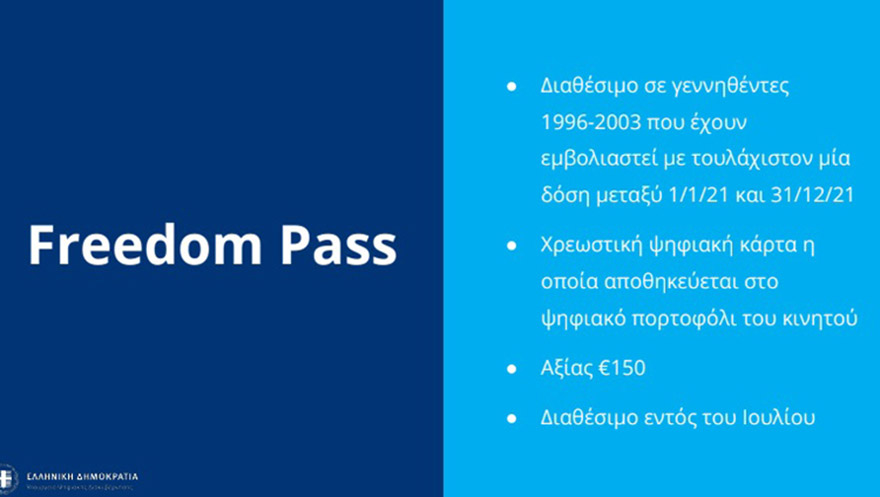 Ειδικότερα, η κάρτα θα λέγεται freedom pass και πρόκειται για χρεωστική ψηφιακή κάρτα αξίας 150 ευρώ, η οποία θα αποθηκεύεται στο ψηφιακό πορτοφόλι του κινητού. Όπως είπε ο υπουργός, «ενθαρρύνουμε τους νέους να ταξιδέψουν και να παρακολουθήσουν πολιτιστικές δραστηριότητες». Η «κάρτα ελευθερίας» θα είναι διαθέσιμη πριν το τρίτο δεκαήμερο του Ιουλίου για όσους έχουν γεννηθεί από το 1996 έως 2003, που είναι εμβολιασμένοι ή έχουν εμβολιαστεί με τουλάχιστον μία δόση ή πρόκειται να εμβολιαστούν.