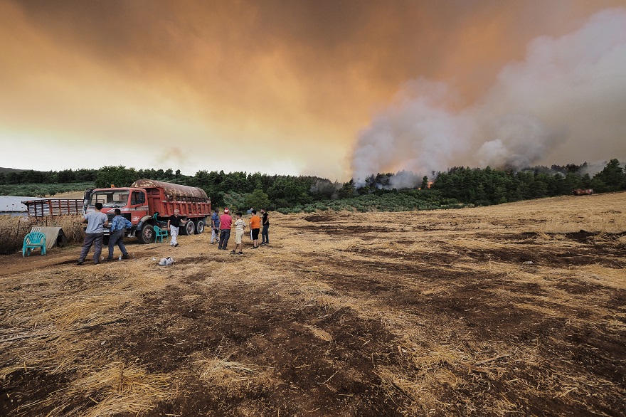 Η φωτιά καίει σε τρία βασικά μέτωπα. Η μάχη δίνεται κοντά στο χωριό Κουρκουλοί καθώς η φωτιά κύκλωσε το χωριό και το προσπέρασε ακολουθώντας μία πορεία προς το χωριό Σκεπαστή που, σύμφωνα με τον περιφερειάρχη Φάνη Σπανό, «αν δεν μπορέσουμε με το φως της μέρας να την σταματήσουμε σε αυτό το σημείο και σύμφωνα με τις συνθήκες που θα επικρατούν τη νύχτα μέχρι το ξημέρωμα μπορεί να φτάσει στο Αιγαίο».