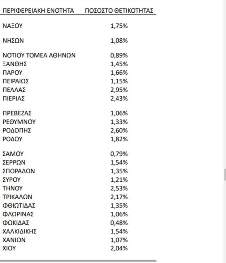 Ο δείκτης θετικότητας για τον κορωνοϊό βρίσκεται πάνω από το 3% σε έξι περιοχές στην Ελλάδα, σύμφωνα με την ανακοίνωση του ΕΟΔΥ.