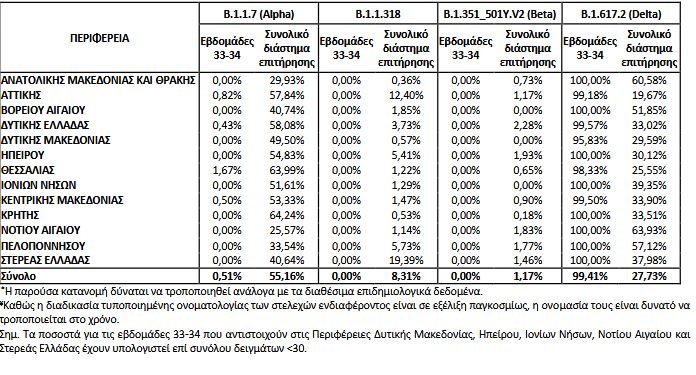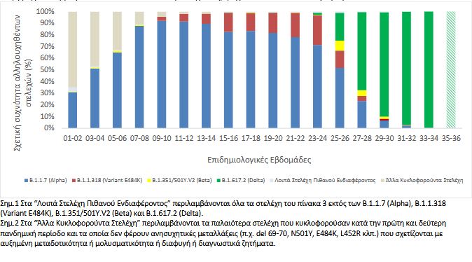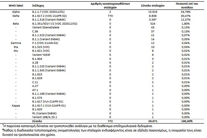Επιπλέον 770 απομονώσεις μεταλλάξεων Δέλτα εντοπίστηκαν την τελευταία εβδομάδα. Πρόκειται για το 99,7% των 772 νεοαπομονωθέντων στελεχών ενδιαφέροντος, στελεχών υπό παρακολούθηση ή υπό διερεύνηση.