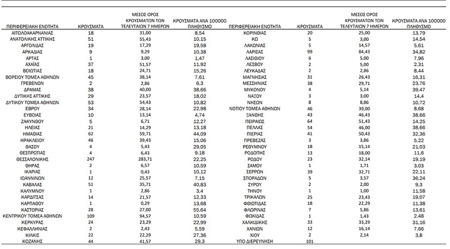 Ο πίνακας με τη γεωγραφική κατανομή για τα κρούσματα σήμερα